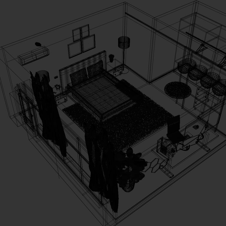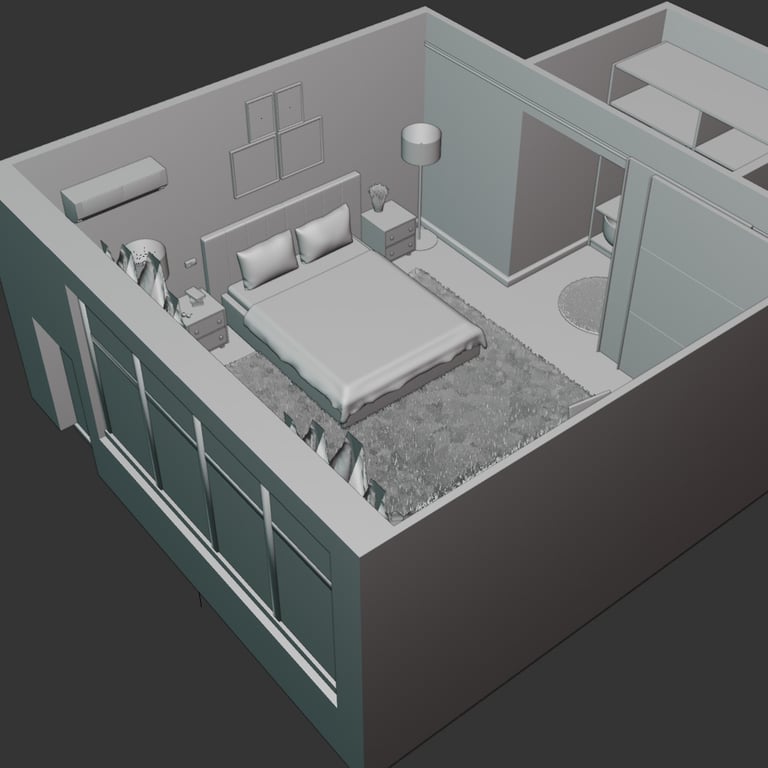 I started from object modeling, building each element of the room through a clear step-by-step process: